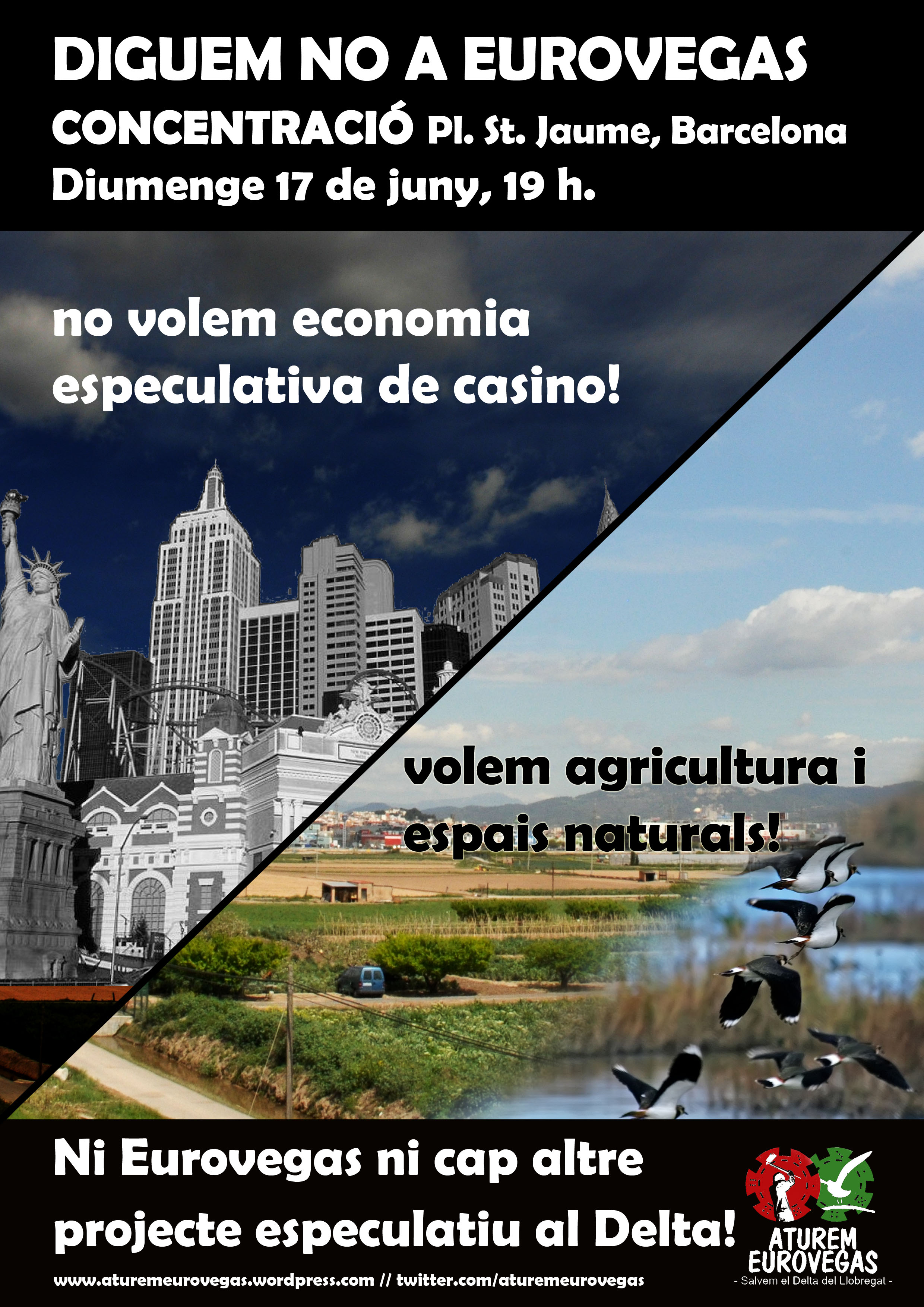Sota el títol “Diguem No a Eurovegas”, la Plataforma ha convocat una concentració el dia 17 d’aquest mes, a les 19h a Plaça Sant Jaume