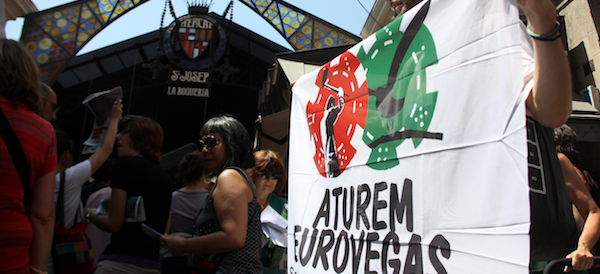 [dropcap color=”#336600″ font=”arial” fontsize=”40″]A[/dropcap]hir al migida una cinquantena d’activistes de la plataforma “Aturem Eurovegas” es va reunir davant del Mercat de la Boqueria, a Barcelona, per expressar el seu rebuig a la instal·lació d’Eurovegas al Baix Llobregat.