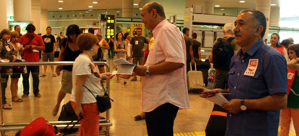 CCOO i la UGT van repartir ahir al matí octavetes entre els turistes que arribaven a l’Aeroport del Prat explicant-los la realitat que viuen els ciutadans i ciutadanes del país que visiten