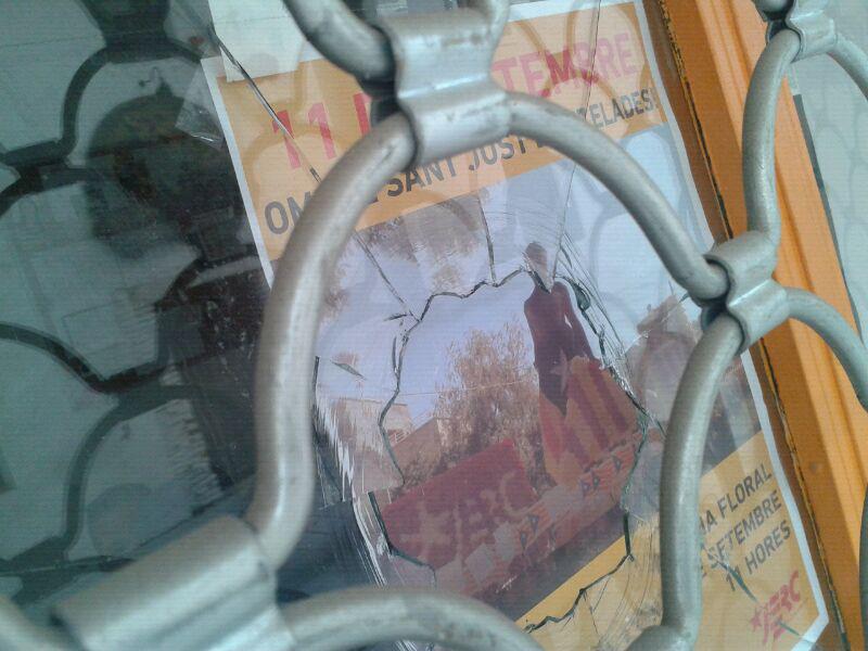 [dropcap color=”#336600″ font=”arial”]S[/dropcap]egons han informat fonts d’ERC Sant Just, els vidres del local delsrepublicans, de la població baixllobregatina, han estat apedregats i trencats, i el material i la mateixa façana de l’edifici també han patit desperfectes.