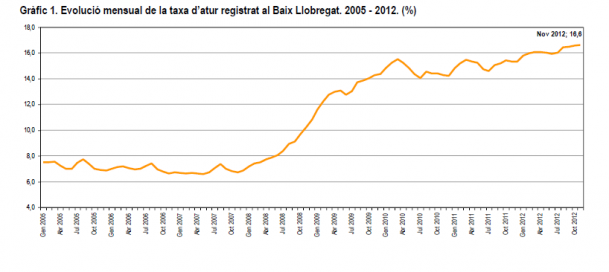 [dropcap color=”#336600″ font=”arial”]A[/dropcap] finals del mes de novembre, l’atur registrat al Baix Llobregat es situava en 71.918 persones, i augmentava respecte el mes anterior en 209 (un 0,3%), fet que situa la comarca en una taxa d’atur registrat del 16,6%, superant tant la taxa mitjana de les comarques de l’Àmbit Territorial Metropolità (ATM) com la del conjunt de Catalunya. Tot i això, l’increment d’aquest mes en termes percentuals ha estat més lleu que a l’ATM i al conjunt de l’àmbit català.