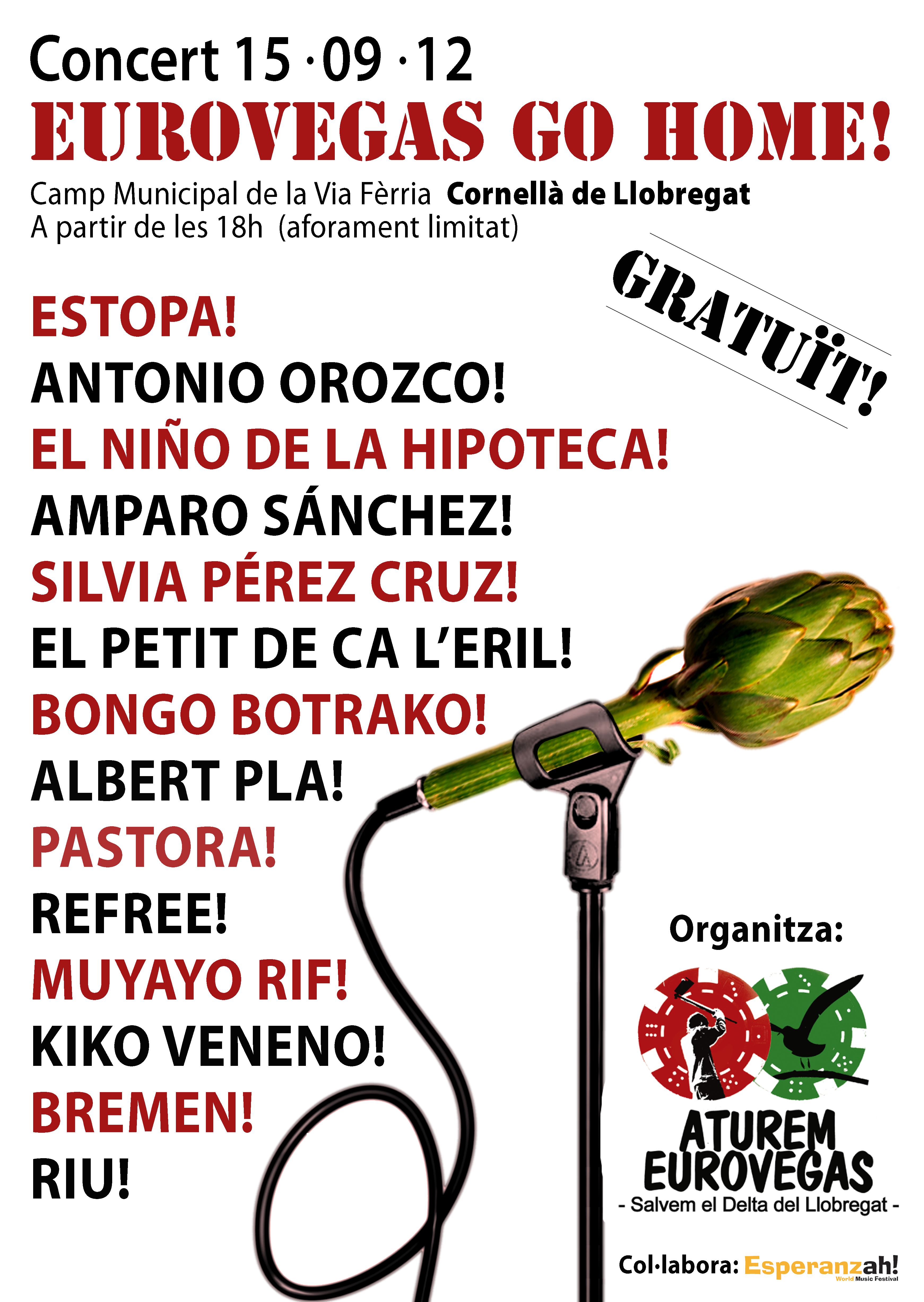 [dropcap color=”#336600″ font=”arial”]E[/dropcap]l gran apoyo popular a la campaña contra el macro-complejo Eurovegas y la complicidad de personas del mundo de la cultura, han hecho posible la realización de un concierto con un cartel con grupos de primer nivel.