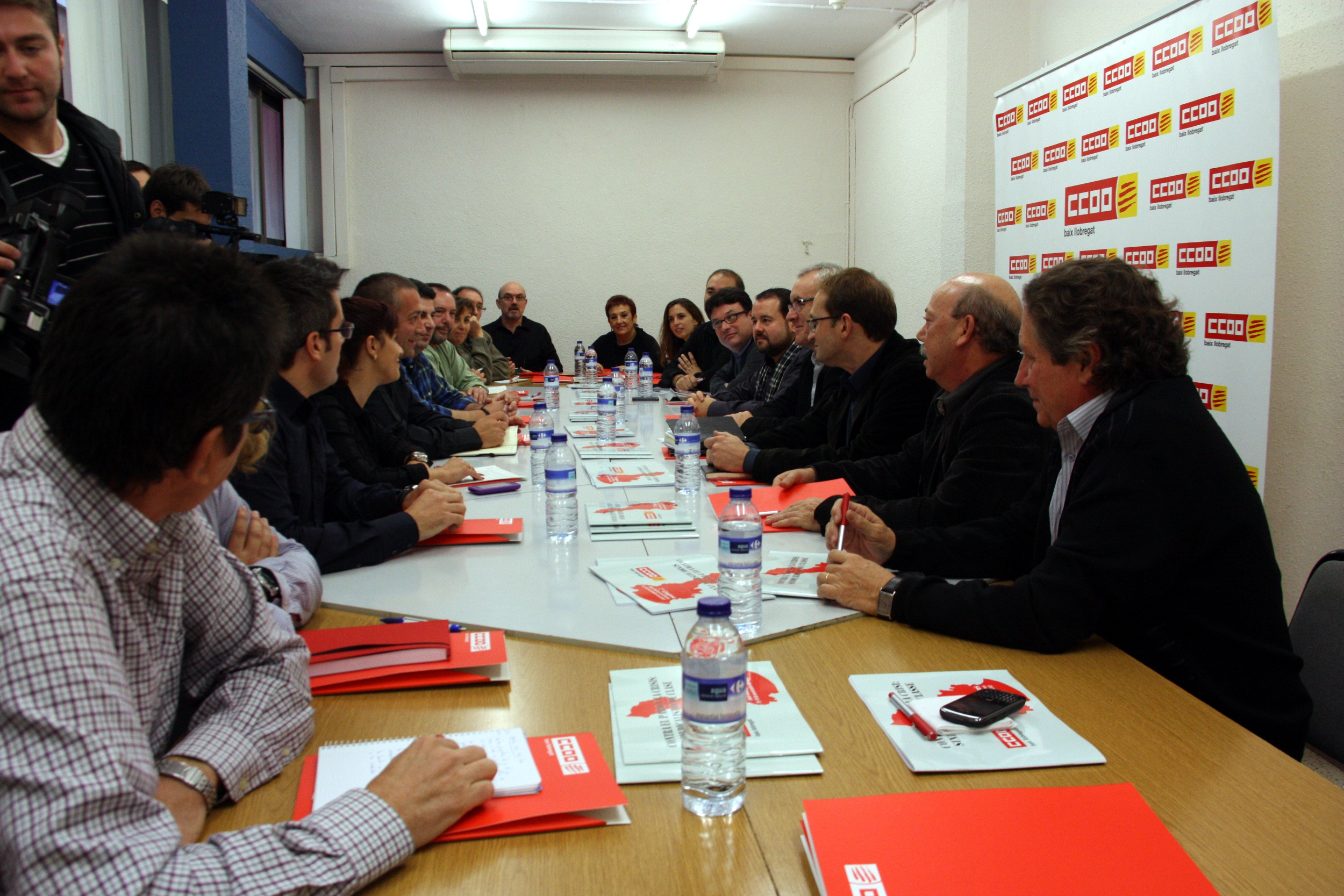 Mena, Lara i Herrera, amb els candidats baixllobregatins Jaume Bosch i Candela López, reunits amb una delegació de CCOO Baix Llobregat. Font:ACN