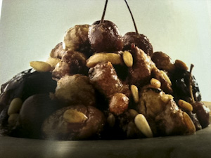 Poseu en remull els fruits secs ( menys l’ametlla) amb aigua tèbia durant una hora. Ofegueu la ceba picada amb el llard. Afegiu-hi la carn magra, deixeu-la enrossir i poseu-hi la salsitxa. Feu-hi la reducció del conyac i afegiu-hi els fruits secs remullats i cobriu-ho amb aigua o caldo. Deixeu-ho coure a foc lent una hora, remenant de tant en tant perquè no s’enganxi. En els últims 10 minuts tireu-hi la picada d’ametlles. Proveu-ho de sal i rectifiqueu-ho.