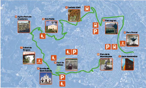L’Anella Verda és transitable per a vianants i ciclistes des de fa un any i recorre espais de la comarca d’interès paisatgístic (com el parc fluvial o la muntanya de Sant Ramon) i cultural (com les Termes Romanes o la cripta de la Colònia Güell)