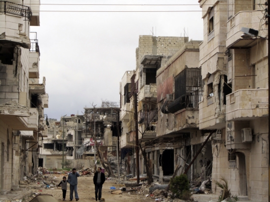 A la imatge, cases danyades al districte d’Inshaat a Homs. Font:ACN