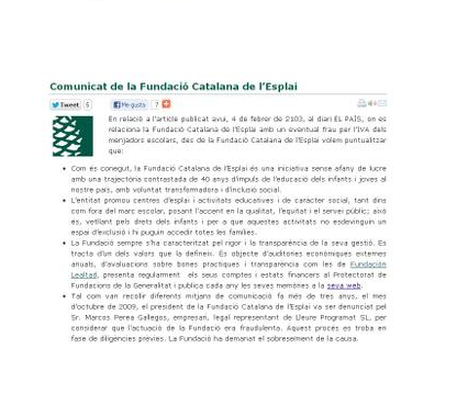 De fet, la Fundació Catalana de l’Esplai exposa en un comunicat que ja ha presentat una querella contra aquest empresari per difamació. També destaca que compta amb auditories econòmiques externes anuals com és el cas de la FUNDACIÓN LEALTAD qui assegura que compleix amb tots els principis de bones pràctiques i transparència. Igualment, l’organisme defensa que ja presenta regularment els seus comptes al Protectorat de Fundacions del Govern català.