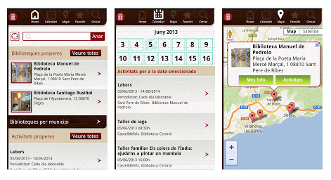 L’aplicació dóna opció de veure les biblioteques al mapa i guardar activitats i biblioteques preferides.