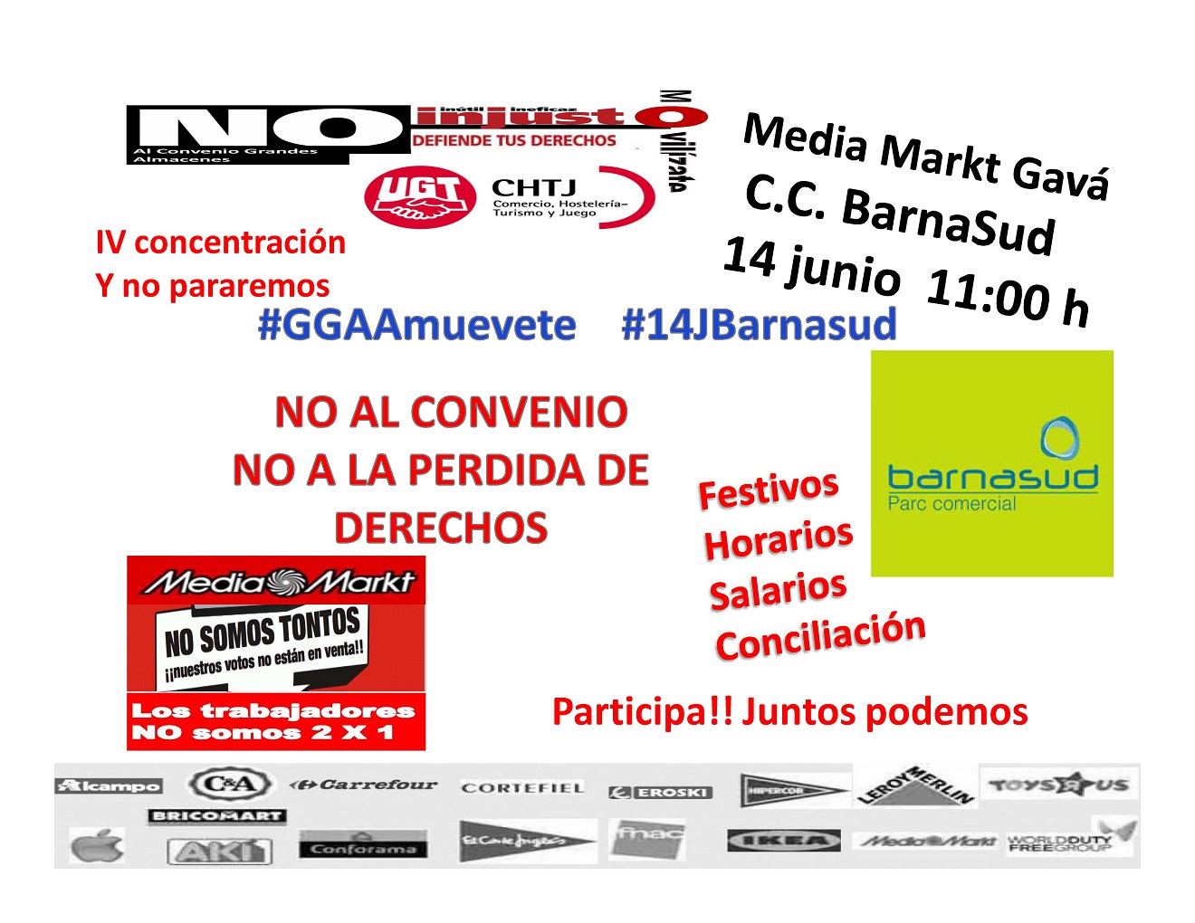 [dropcap color=”#336600″ font=”arial”]E[/dropcap]n el marc de les actuacions en contra del Conveni Col·lectiu de Grans Magatzems que està realitzant UGT, es celebrarà aquesta concentració convocada per “lluitar contra la pèrdua de salaris i l’ampliació d’horaris” que estan patint els treballadors i treballadores del sector, segons el sindicat.