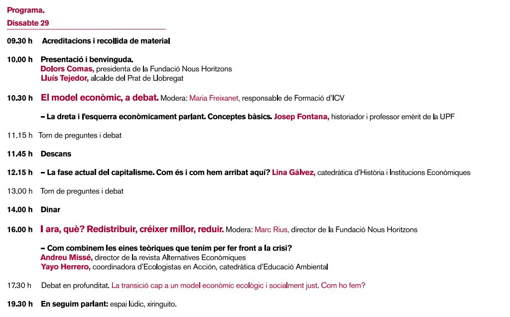 L'”Escola d’estiu 2013. Esquerra, ecologia i llibertat”, organitzada per la fundació del partit, la Fundació Nous Horitzons; tindrà lloc entre avui a les 9:30h i demà diumenge a les 13h, al Centre Esplai del Prat de Llobregat, amb el títol “Economia des de l’esquerra”