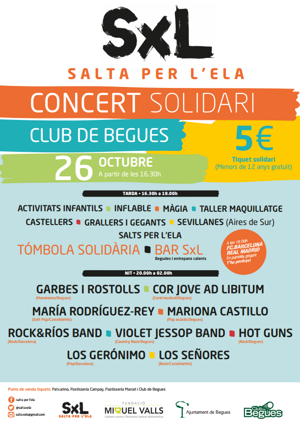 El proper dissabte 26 d’octubre a partir de les 16.30 h se celebrarà a Begues una festa solidària per recaptar fons per a la Fundació Miquel Valls. Aquesta entitat dóna suport i atenció especialitzada a persones afectades per l’esclerosi lateral amiotròfica (ELA) i a les seves famílies a tot Catalunya