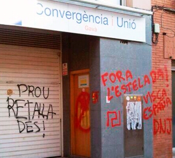 [dropcap color=”#336600″ font=”arial”]C[/dropcap]iU ha denunciat aquesta setmana un atac feixista a la seva seu de Gavà i danys en aparells electrònics i mobiliari. Els nacionalistes atribueixen l’atac a “elements d’extrema dreta” que han pintat en la façana frases com “Prou retallades”, “Sempre unionistes” o “Visca Espanya”.