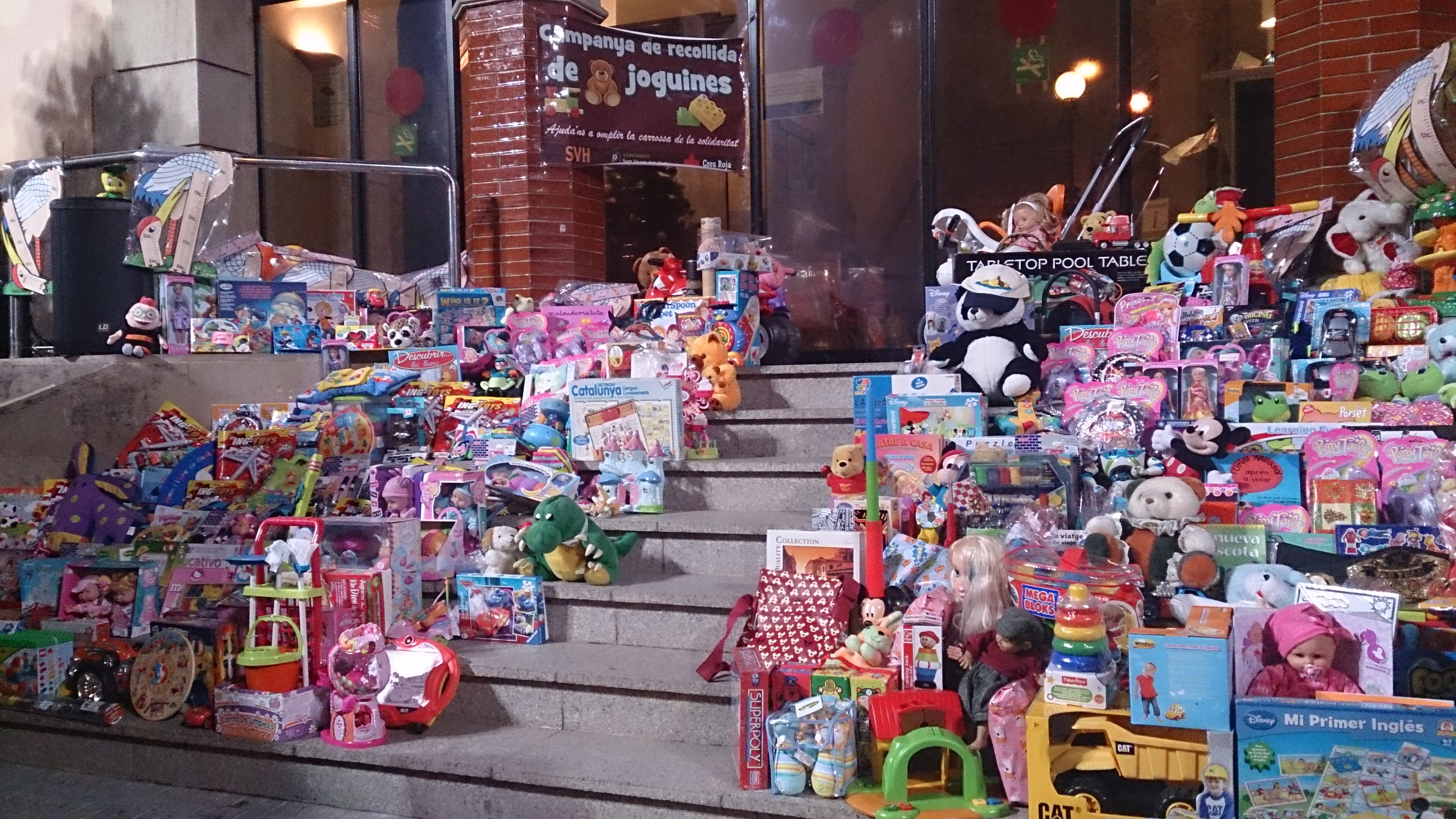 De joguina en joguina, les escales de l’Ajuntament es van anar cobrint fins al punt que, per segon any consecutiu, va caldre posar taules als laterals de les escales per encabir totes les joguines que arribaven de part de botigues, ciutadans a títol individual i entitats. Entre les aportacions més nombroses hi ha les del Club de Ball Esportiu Sant Vicenç dels Horts, la Casa d’Andalusia, Dones amb Iniciativa, el C.F. Bar Mi Casa i els Mossos d’Esquadra, que hi han participat per primer cop a la campanya de joguines fent d’enllaç amb les empreses dels polígons industrials de Sant Vicenç dels Horts. El dia també va deixar alguna anècdota, com l’aportació d’una comunitat de veïns que es van organitzar per donar una bona pila de joguines.