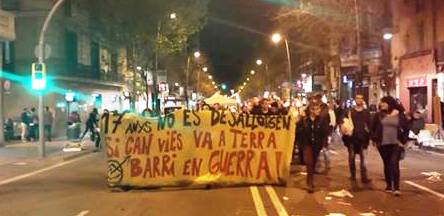 La protesta arriba després de dos dies de manifestacions i aldarulls com a reacció al desallotjament. El miler de concentrats, que han arribat des de diversos barris de la ciutat, han tallat la carretera de Sants i han protagonitzat una cassolada de protesta contra la decisió de desallotjar l’edifici ocupat -propietat de TMB- i enderrocar-lo. L’acte s’ha desenvolupat de manera pacífica i ha congregat majoritàriament gent jove, però també s’hi han pogut veure persones de totes les edats i fins i tot, famílies senceres.