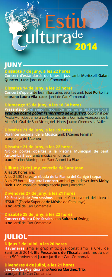 Arriba l’estiu i a Sant Vicenç dels Horts arriba l’Estiu de Cultura. Música clàssica, jazz, blues, òpera, recitals de poesia… Són només algunes de les propostes d’aquest cicle d’activitats culturals que cada any organitza l’Ajuntament de Sant Vicenç dels Horts. Un concert de blues i jazz a càrrec de Meritxell Galan Quartet al jardí de Can Comamala el passat dissabte 7 de juny, va donar el tret de sortida d’enguany. I a partir d’aquí, se succeiran més d’una vintena d’activitats durant els mesos de juny i juliol. Aquest cap de setmana, avui dissabte d’òpera i diumenge la presentació del segon recull de memòria històrica oral Veus del nostre poble: l’empremta de la guerra
