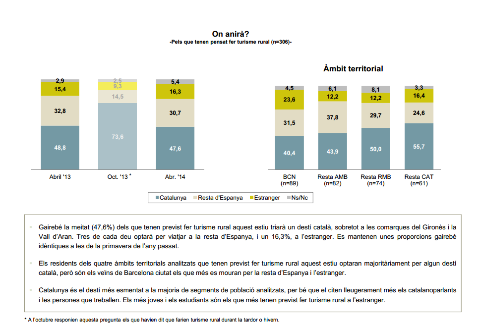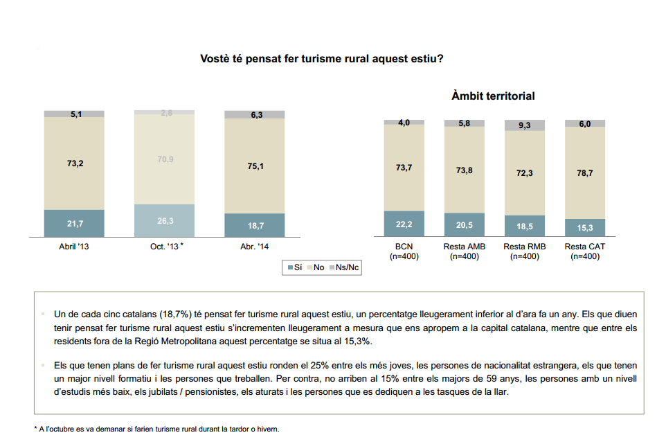 L’estudi respon a les preguntes “Vostè té pensat fer turisme Rural aquest estiu?”, “On anirà?” i “Per quin motiu no farà turisme rural?”, formulades entre finals d’abril i principis de maig a 1.600 persones més grans de 16 anys, residents a Catalunya des de fa almenys un any. Aquest és el primer cop que es disposen de dades per poder comparar-les amb les expectatives de l’any anterior.