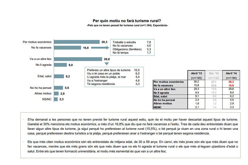 Els motius econòmics són adduïts pels entrevistats de mitjana edat (30 a 59 anys). En canvi, els més joves són els que més diuen que no fan vacances, mentre que els més grans són els que més afirmen que no els agrada el turisme rural o els que més al·leguen qüestions d’edat o salut. Entre els que tenen formació universitària, el motiu més esmentat és que van a un altre lloc.
