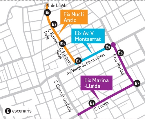 Al llarg del recorregut hi haurà vuit escenaris en els quals es faran diverses actuacions musicals, dansa, monòlegs, mim, dibuix, microteatre, cercaviles, masterclass de zumba, titelles, bombolles gegants, etc