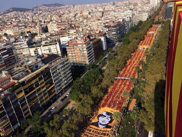 Les dues columnes humanes de la Via Catalana 2014 que formaven una gran senyera, van confluir al vèrtex de la plaça de les Glòries a les 17:14h. formant la gran ‘V’ amb què centenars de milers de catalans i catalanes, entre ells milers de baixllobregatins que ocupaven els trams del 35 a 39, van reclamar poder votar el 9 de novembre.