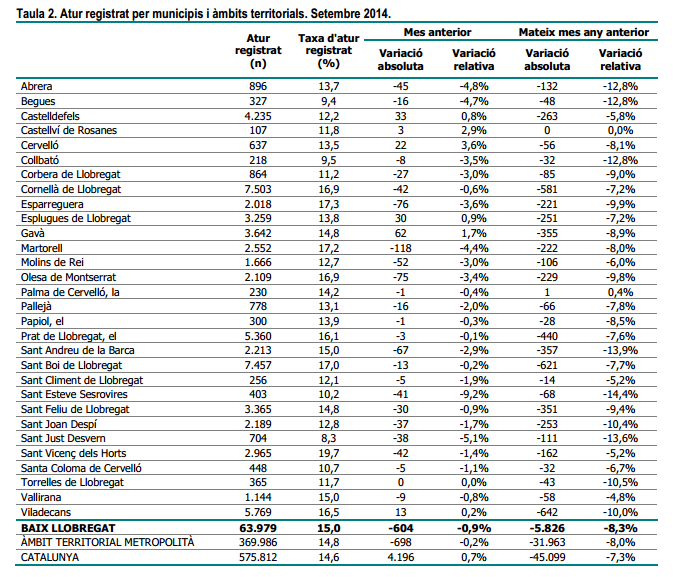 A finals del mes de setembre, l’atur registrat al Baix Llobregat s’ha situat en 63.979 persones, disminuint respecte el mes anterior en 604 (-0,9%) i situant la taxa d’atur registrat al 15,0%. Es continua superant la taxa mitjana d’atur de les comarques de l’Àmbit territorial metropolità i la del conjunt de Catalunya. En termes interanuals disminueix l’atur registrat en tots els àmbits territorials. El nombre de persones registrades a les oficines al Baix Llobregat ha disminuït en 5.826 respecte setembre de 2013