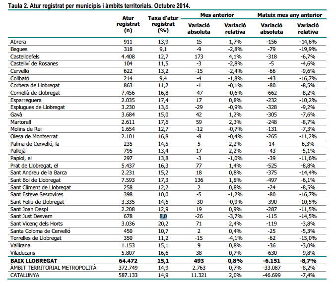 A finals del mes d’octubre, l’atur registrat al Baix Llobregat s’ha situat en 64.472 persones, augmentant respecte el mes anterior en 493 (0,8%) i situant la taxa d’atur registrat al 15,1%. Es continua superant la taxa mitjana d’atur de les comarques de l’Àmbit territorial metropolità i la del conjunt de Catalunya. En termes interanuals disminueix l’atur registrat en tots els àmbits territorials. El nombre de persones registrades a les oficines al Baix Llobregat ha disminuït en 6.151 respecte octubre de 2013