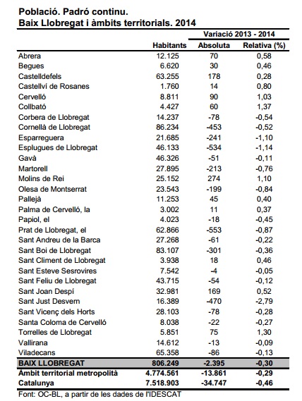L’Institut d’Estadística de Catalunya (IDESCAT) ha difós les xifres de població oficials del padró municipal. La comarca ha experimentat una disminució del 0,3% (2.395 persones menys respecte a l’any anterior), arribant a un total de 806.249 habitants