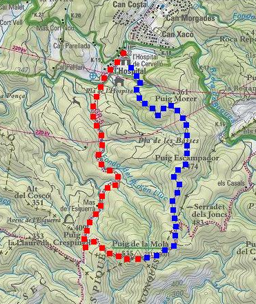 2.30 Cruïlla (401): en un revolt a la dreta, deixo la pista i prenc un camí cap a l’esquerra (no senyalitzat) que s’interna al bosc. El camí passa pel costat de les runes del Corral de l’Hospital (270) i arriba al Pla de l’Hospital entre vinyes.