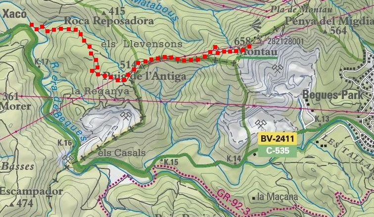Un estret sender (556) em permet tallar la pista que descriu un revolt cap a la dreta. Arribo a una cruïlla (624) i segueixo la pista principal cap a l’esquerra (per la dreta s’arriba a una cota secundària (636) sobre la pedrera de Begues).