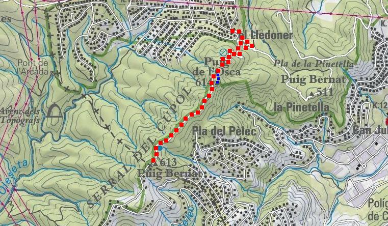 0.40 Puig Bernat (612): al cim hi ha una rotonda de la carretera asfaltada que ve de les urbanitzacions del sud i rodeja un dipòsit, així com l’estació d’un radar meteorològic. Descanso 5 minuts al cim gaudint de les bones vistes i torno pel mateix camí.