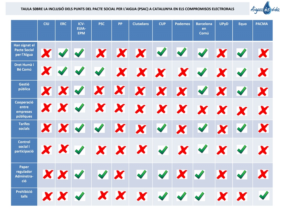 Aigua és Vida hem analitzat els programes electorals de dotze forces polítiques per tal de veure quins compromisos han adquirit amb la ciutadania davant de la nova convocatòria electoral. Per una banda es constata que aquelles que han firmat el Pacte Social mostren una major sensibilitat i interès a abordar la qüestió de la gestió de l’aigua; i per l’altra destaca l’absència, en 6 forces polítiques, del reconeixement bàsic de l’aigua i el sanejament com un Dret Humà, consideració reconeguda per l’ONU el 2010 i fonament sobre el qual s’hauria de construir tota política hídrica. Aquesta manca de reconeixement porta associada una realitat molt més crua: el baix nivell de compromís amb prohibir els talls d’aigua domiciliaris a les famílies que no poden pagar el rebut, una qüestió fonamental a la qual només 5 de les 12 forces polítiques s’hi comprometen.