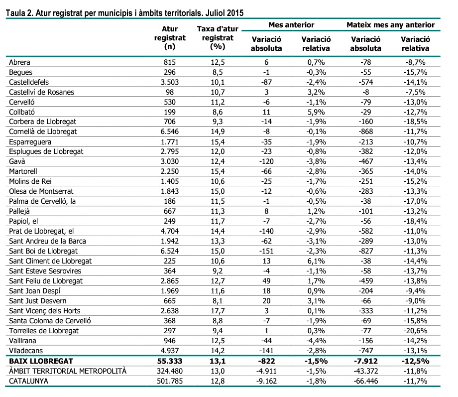 Amb aquestes dades, es supera la taxa d’atur del conjunt de Catalunya i la taxa mitjana de les comarques de l’Àmbit territorial metropolità. Però en termes interanuals disminueix l’atur registrat en tots els àmbits territorials i el nombre de persones registrades a les oficines al Baix Llobregat ha disminuït en 7.912 respecte juliol de 2014.