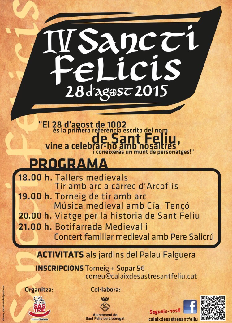 Sota el nom de “IV Sancti Felicis”, l’Associació Cultural Calaix de Sastre, amb el suport de l’Associació Voluntariat de Sant Feliu, organitzarà a partir de les 18 h diferents tallers medievals, així com una activitat de tir amb arc.