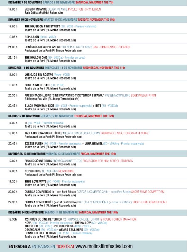 Aquí teniu la programació del Festival d’aquest any, on podeu trobar els horaris de les projeccions de les pel·lícules, així com de tots els actes paral·lels que inclou el Festival. Disfruteu el #TerrorMolins!