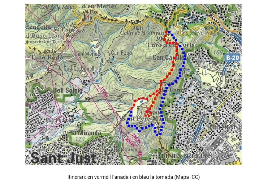 Ascensió a Sant Pere Màrtir des de la Plaça de Mireia, a Sant Just Desvern, continuant pel Camí de la Carena fins al Turó d’en Corts i tornada per la Carretera de les Aigües. Sant Pere Màrtir està situat a l’extrem oriental de la Serra de Collserola. La carena continua cap al nord fins al Turó d’en Corts, on vira a l’oest per tancar la vall de Sant Just. La transitada Carretera de les Aigües discorre pel seu vessant barceloní.