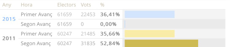 La participació a les 14h és similar tant al 27S com a les Generals del 2011. Enguany l’avenç a la província de Barcelona, on s’inclou el Baix Llobregat, és del 35’8%, respecte un 36% de fa quatre anys. El 27S va ser d’un 34’72%. Pel que fa les dades del global de Catalunya, és un 0’2% més baixa, d’un 35’5% a un 35’3%, mentre que el 27S va ser d’un 35’09%. Les dades són lleugerament inferiors a les de 2011 a la circumscripció de Barcelona, malgrat a Cornellà, des d’on hem seguit les primeres hores de la jornada electoral, la tendència ha estat la contrària i ha augmentat gairebé un punt la participació