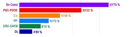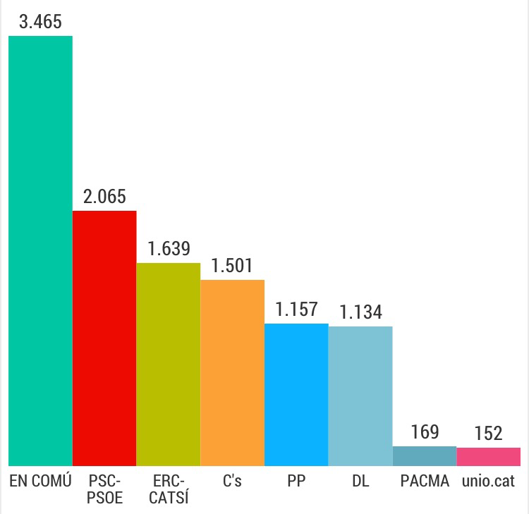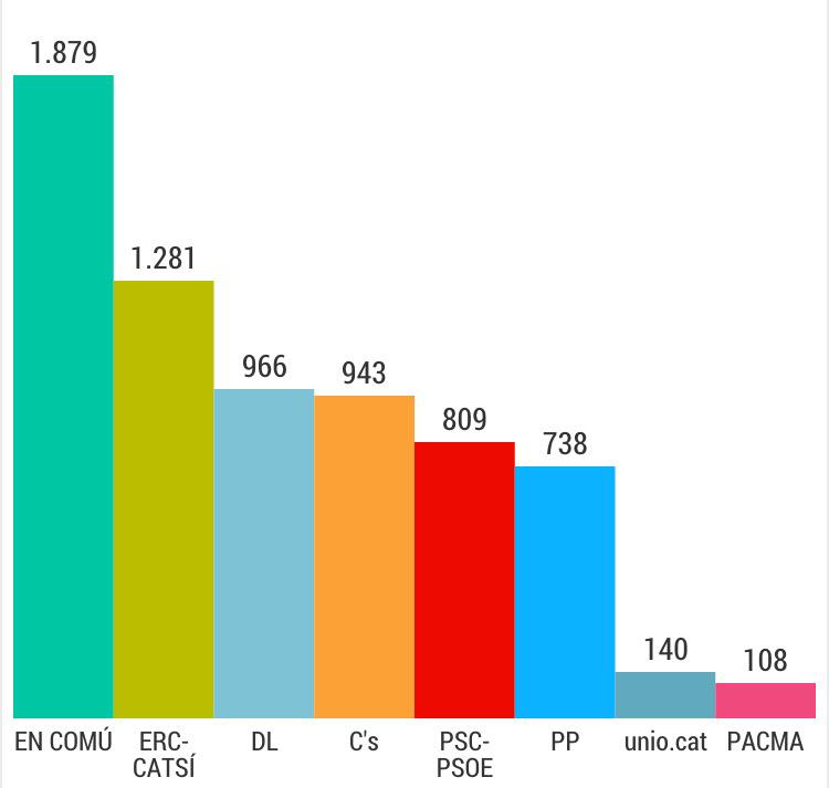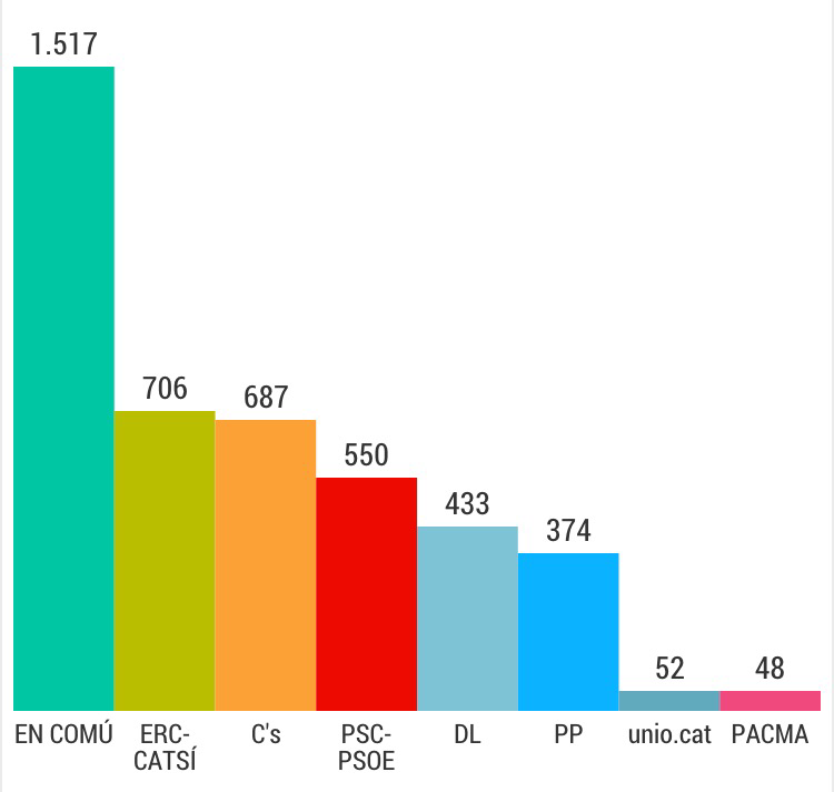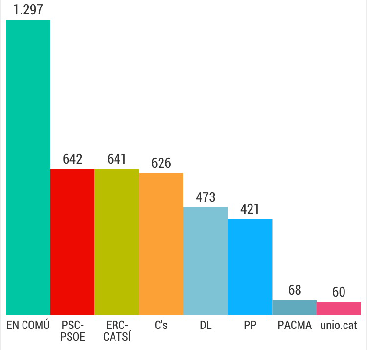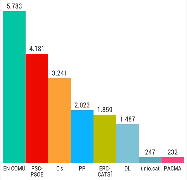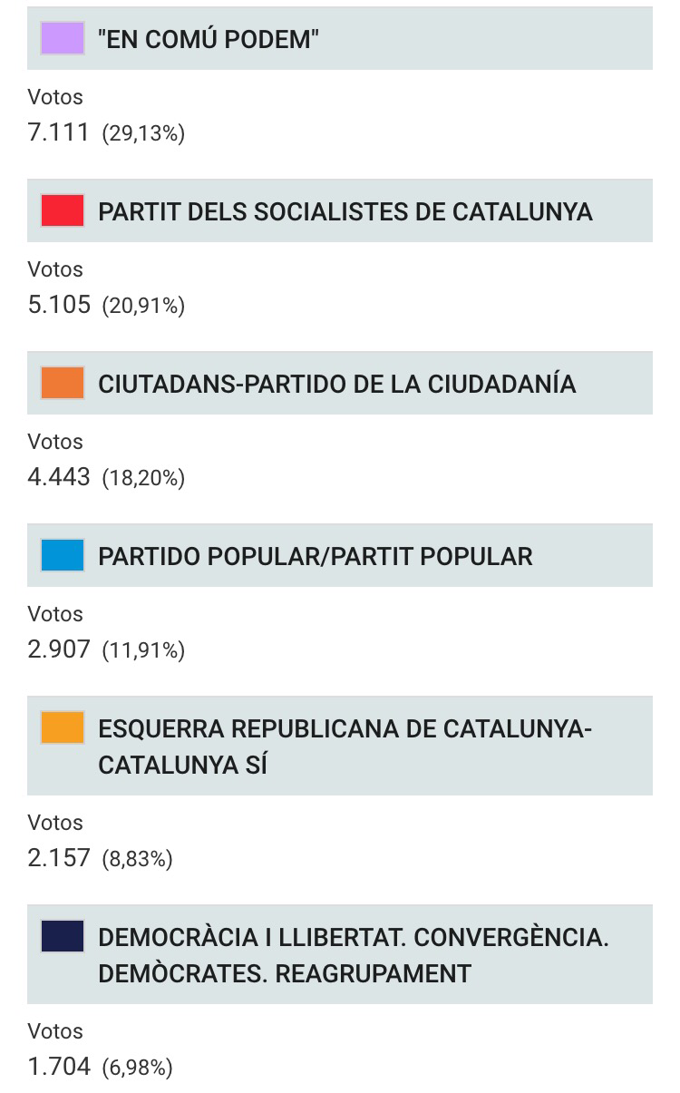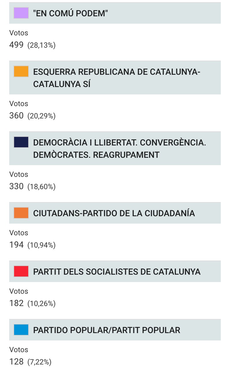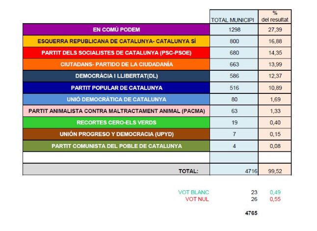 Un cop finalitzat l’escrutini En Comú Podem aconseguia el suport majoritari amb 952 vots (25,88 per cent) seguit per Esquerra Republicana de Catalunya amb 764 vots (20,77 per cent), Democràcia i Llibertat amb 679 vots (18,46 per cent), Ciutadans amb 543 vots (14,76 per cent), Partit dels Socialistes de Catalunya amb 314 vots (8,54 per cent) i Partit Popular amb 277 vots (7,53 per cent).