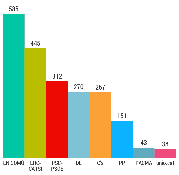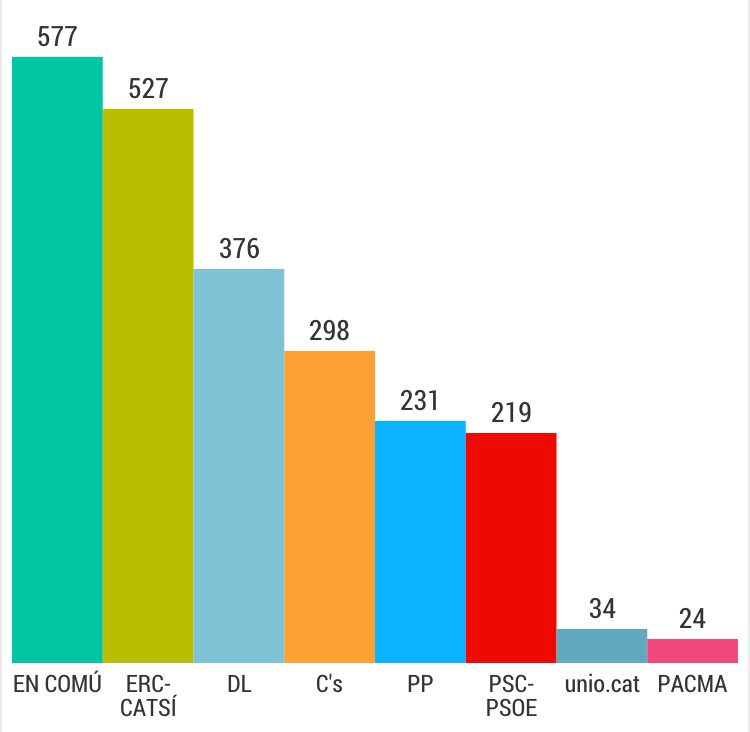 Els 47 diputats i diputades que s’havien d’escollir a Catalunya han quedat repartits de la següent manera: En Comú Podem 12; ERC 9; PSC 8; Democràcia i Llibertat 8; Ciudadanos 5, i PP 5.