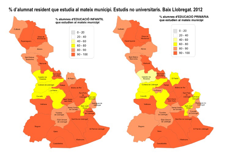 A mesura que augmenta l’edat dels escolars s’incrementa el nombre de desplaçaments fora del municipi. Així, el 96% dels alumnes d’Educació Infantil del Baix Llobregat estan matriculats en el municipi de residència, percentatge que és del 95% en el cas dels estudis de primària i del 93% entre els estudiants de secundària.