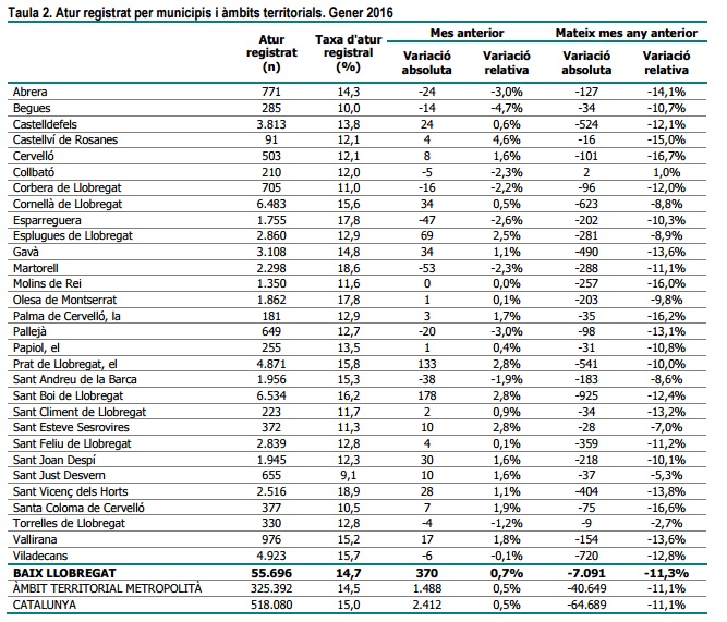 Es supera lleugerament la taxa mitjana de les comarques de l’Àmbit territorial metropolità però no la del conjunt de Catalunya. En termes interanuals disminueix l’atur registrat en tots els àmbits territorials. El nombre de persones registrades a les oficines al Baix Llobregat ha disminuït en 7.091 respecte a gener de 2015.