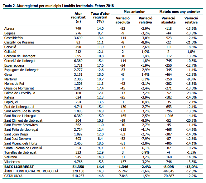 Es supera lleugerament la taxa mitjana de les comarques de l’Àmbit territorial metropolità però no la del conjunt de Catalunya. En termes interanuals disminueix l’atur registrat en tots els àmbits territorials. El nombre de persones registrades a les oficines al Baix Llobregat ha disminuït en 8.098 respecte a febrer de 2015.