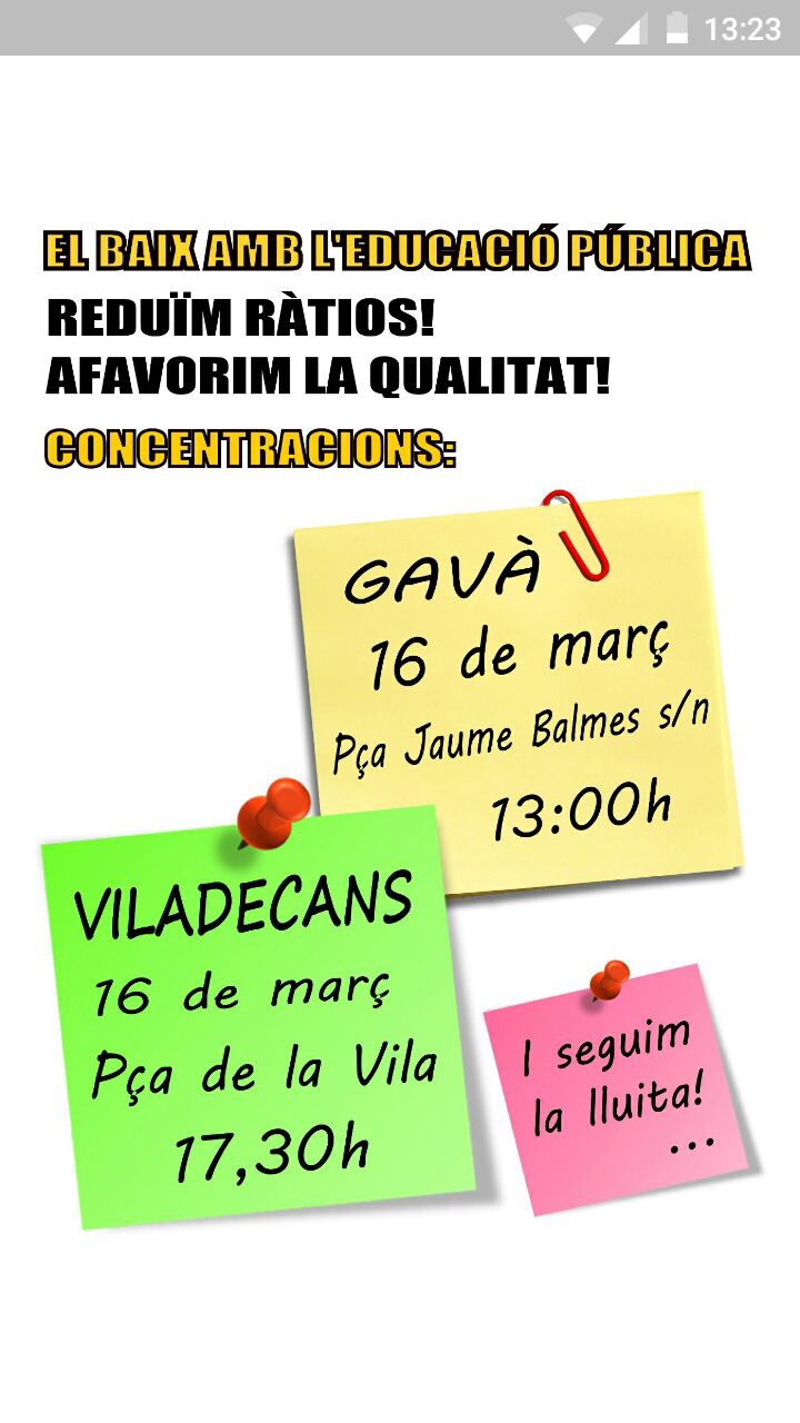 Desenes de persones es van manifestar ahir al migdia a la plaça Jaumes Balmes de Gavà per demanar ràtios baixes a les aules i contra el tancament de línies. Per la tarda, va ser el torn de la comunitat educativa de Viladecans, que també va realitzar una concentració de protesta