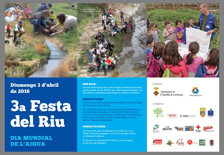 Cornellà celebra aquest any la Festa del Riu el diumenge 3 abril. Durant tot el matí l’entorn del riu Llobregat s’omple d’activitats, que van des de tallers familiars relacionats amb la flora i la fauna que hi ha, una plantada d’arbres, a excursions a peu o amb bicicleta, i una carrera d’obstacles per als més esportistes