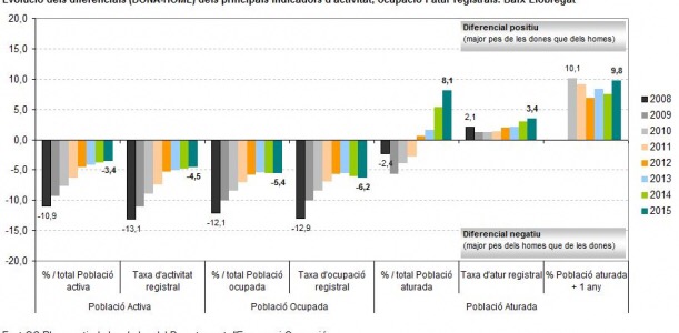 Pel que fa a l’ocupació, la situació de les dones encara es troba per sota de la dels homes tot i que també s’ha donat una tendència d’igualació en aquest sentit. Tot i això, també cal matisar que en els dos darrers anys la recuperació de l’ocupació ha anat més per la part dels homes que de les dones.