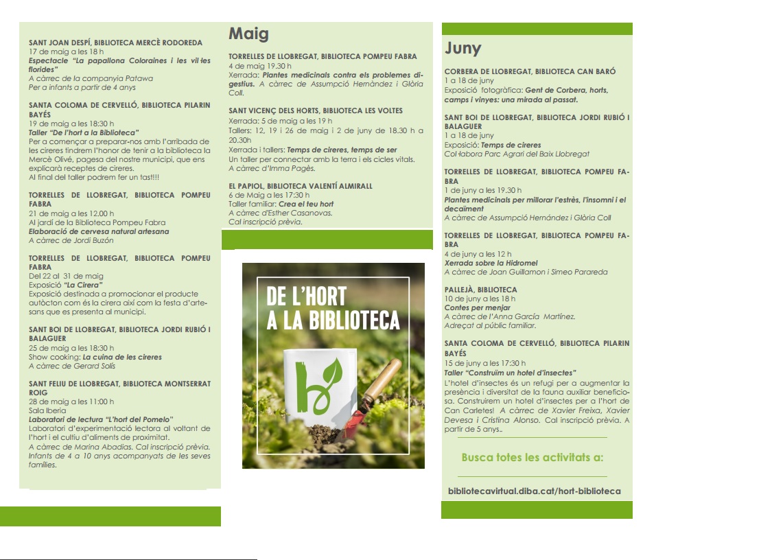 Ja es pot consultar la programació dels mesos de maig i juny del cicle “De l’hort a la biblioteca”, un projecte que compta amb la participació de 13 biblioteques del Baix Llobregat, adscrites a la Xarxa de Biblioteques Municipals de la Diputació de Barcelona, que vol donar a conèixer els productes de proximitat i temporada del Parc Agrari del Baix Llobregat