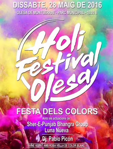 Al Holi Festival Olesa es faran 3 tirandes de color a l’aire: 19h, 20h i 21h. La festa combinarà els colors amb la música i, de fet, no només serà electrònica, sinó que també es podrà ballar al ritme de les millors cançons de l’Índia. A l’escenari hi haurà actuacions de Sher-E Punjab Bhangra Group i Luna Nueva.