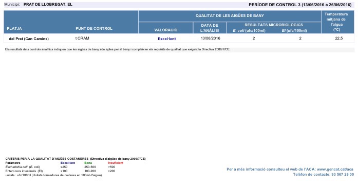 L’analítica feta el dia 13 de juny a la platja del Prat ha donat com resultat una qualitat excel·lent, amb absència de contaminació microbiològica.