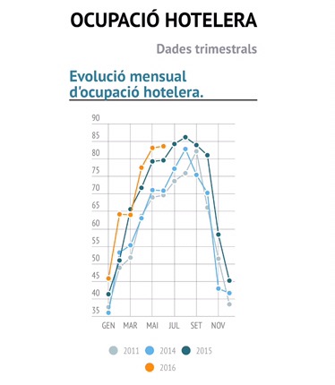 L’ocupació observada supera a l’ocupació prevista. La marxa del negoci del sector hosteler (restauració i allotjament, principalment) millora de manera significativa respecte el mateix període de l’any anterior. Es registra una disminució generalitzada dels preus de venda del sector hosteler respecte el mateix trimestre de 2015.