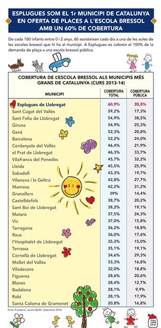 L’informe subratlla, a més, que en el conjunt de Catalunya queden anualment un 10,2% de places públiques sense cobrir. En el cas d’Esplugues, és 0, ja que cada any es cobreix al 100% la demanda, gràcies a les quatre escoles bressol municipals (La Mainada, Montserrat, Montesa i Marta Mata) i la de la Generalitat (El Sucre).