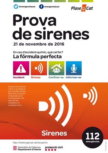A través de la sirena s’emetran tres senyals d’alarma d’un minut de durada separats per silencis de cinc segons. El final de la prova s’anunciarà amb un senyal continu de 30 segons de durada. En acabar el simulacre es farà una valoració de l’efectivitat del Pla d’emergència del risc químic a Catalunya (Plaseqcat)