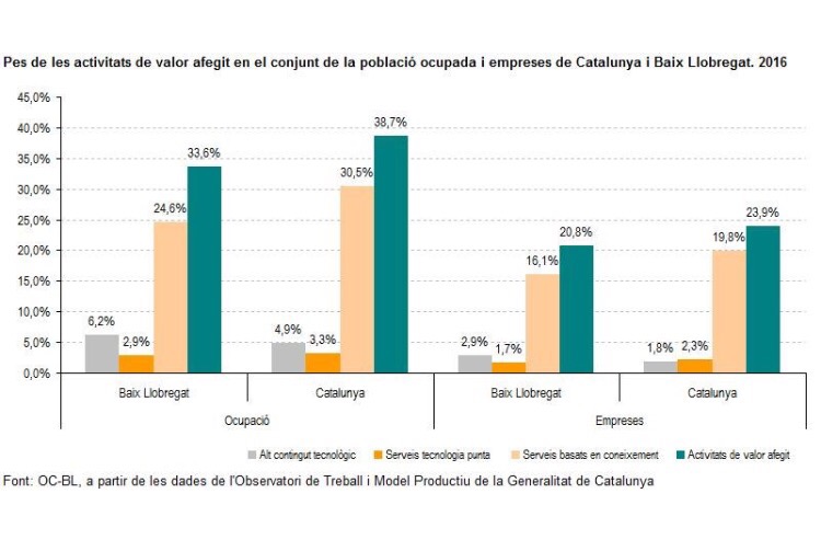 Al Baix Llobregat, el 21% de les empreses i 34% de la població ocupada ho està en activitats d’alt valor afegit. La majoria d’aquestes activitats (més del 16% d’empreses i el 25% de població ocupada) són del sector serveis i estan basades en coneixement.